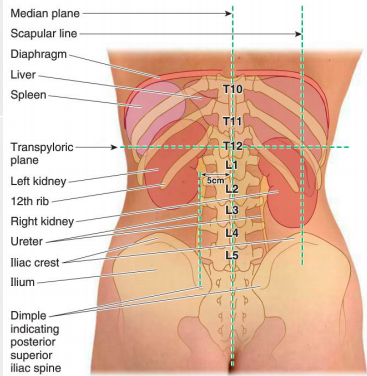 Which spinal levels do the kidneys sit between?
