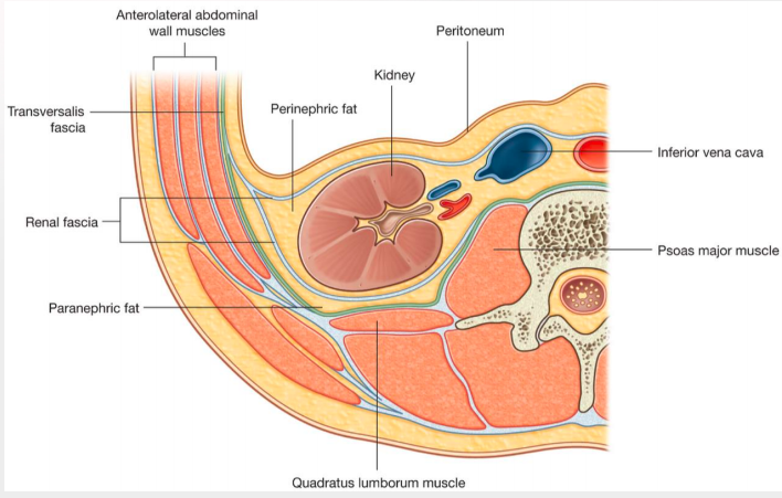What are layers immediately external to renal capsule; where will a perinephric abscess form?