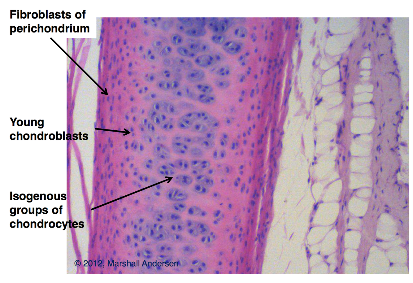 Most common type Avascular Type II collagen Surrounded by perichondrium Translucent, bluish gray to white Solid but flexible Chondrocytes ofter found in cell groups Both appositional and interstitial growth