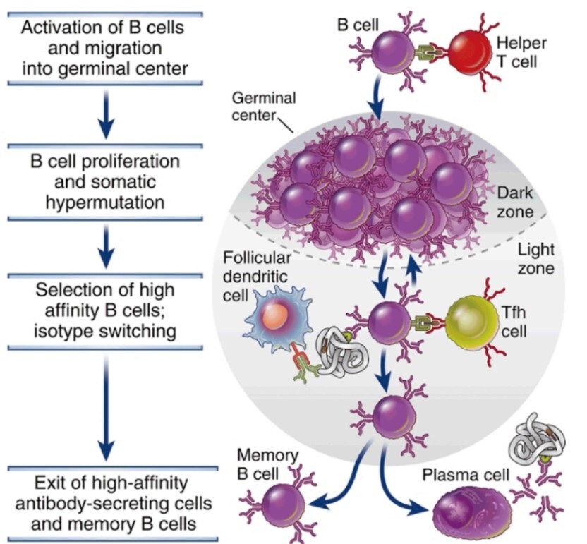 - Dark zones contain germinal center where B cells rapidly divide and undergo somatic hypermutation to improve antibody affinity