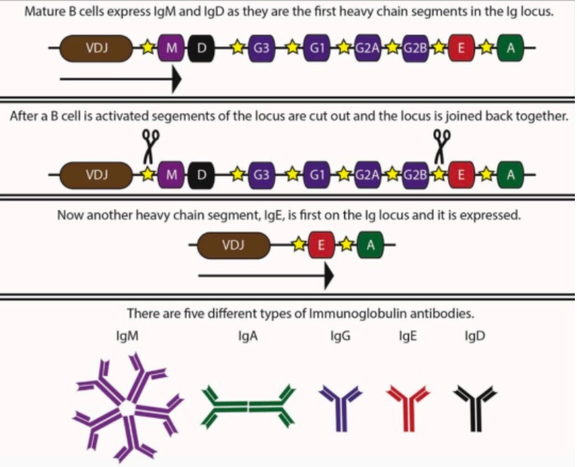 - The B cell produces antibodies with the same antigen specificity but a new isotype, determining its immune function. (VDJ stays unchanged)