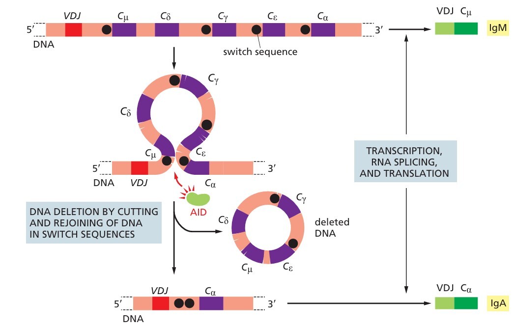 - The V(D)J region is joined to a new constant region (e.g., Cγ for IgG or Cα for IgA).