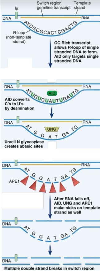 - AID (Activation-Induced Deaminase) deaminates cytosine bases in the switch (S) regions, converting them to uracil.