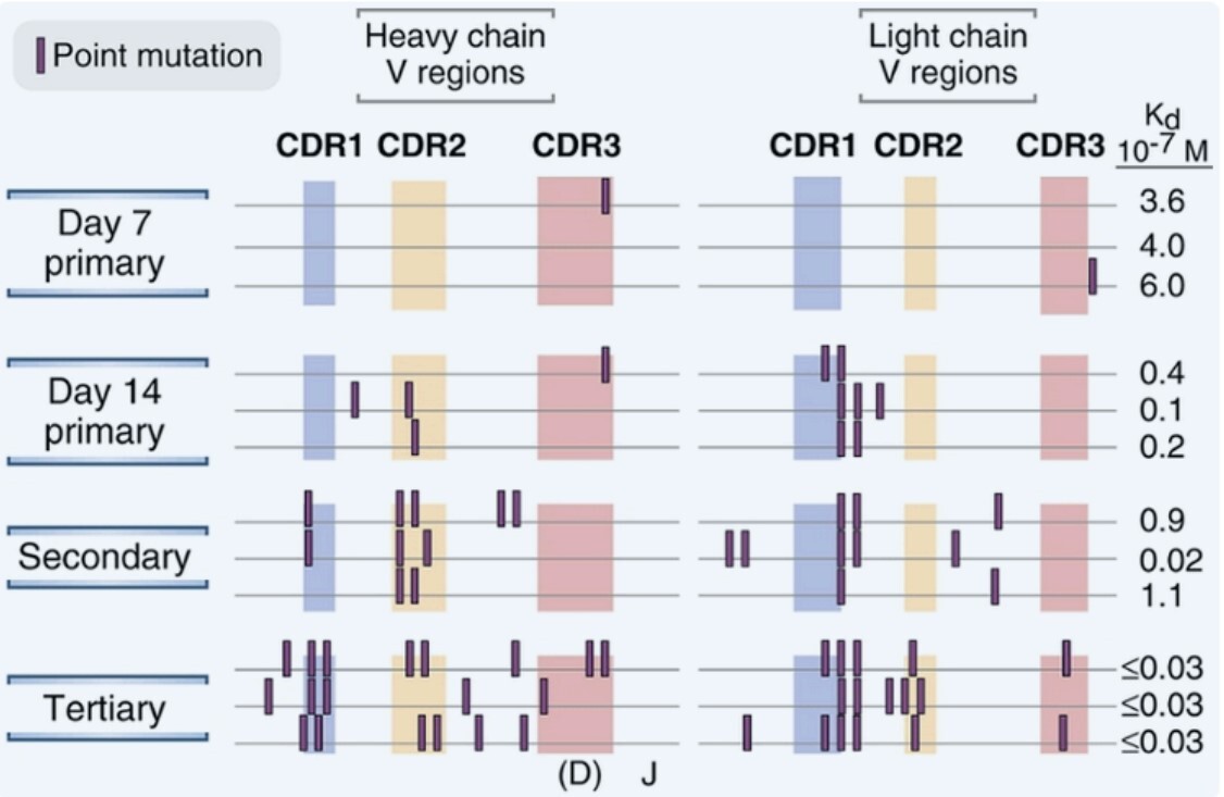 - progressive increase in the affinity of the antibodies due to:
