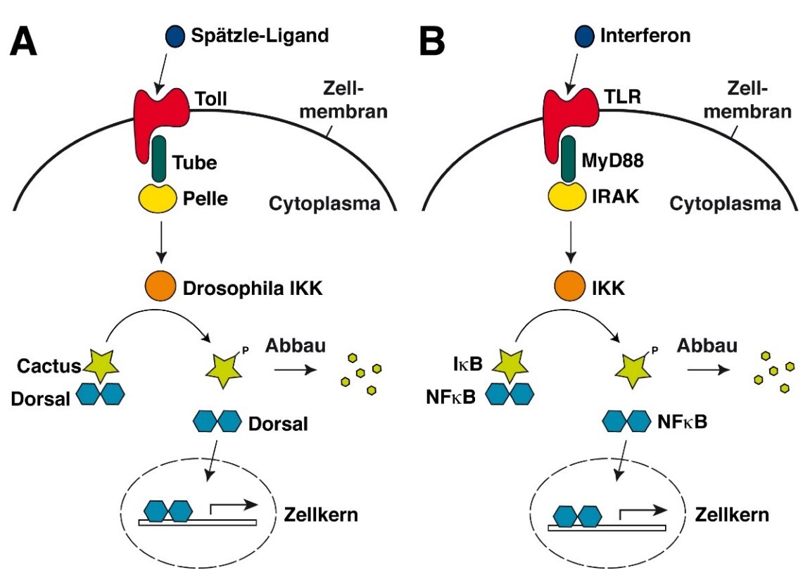 - Once a TLR is activated by Cytokine Spätzle (in insects) or an Interferon (a MAMP) (in humans) it undergoes conformational changes and interacts with adapters (Tube, Pelle), that relay the signal from Toll to downstream components