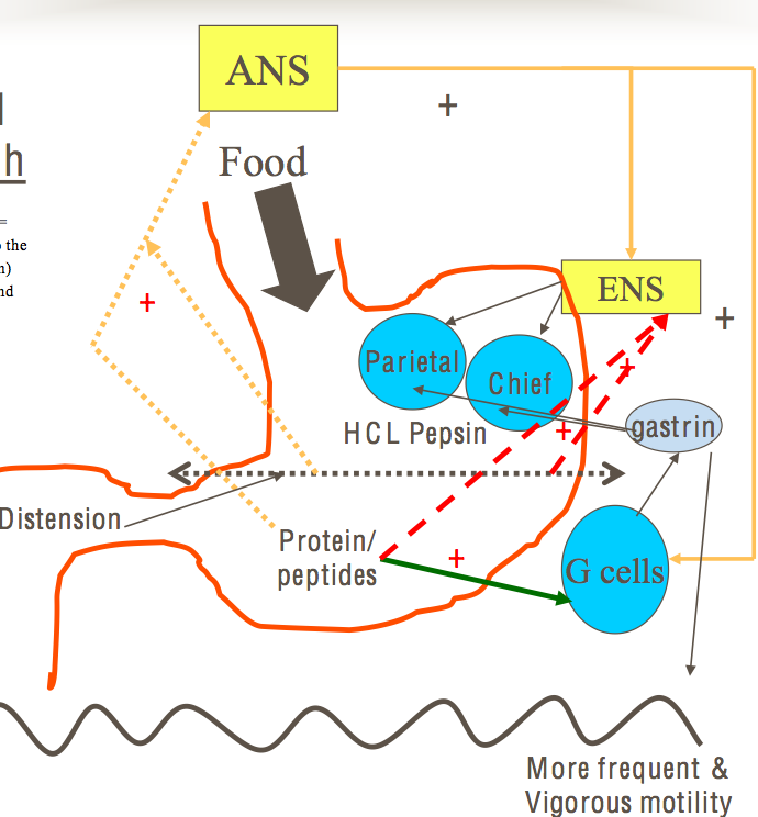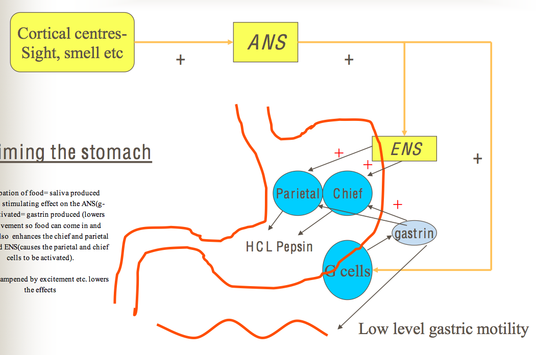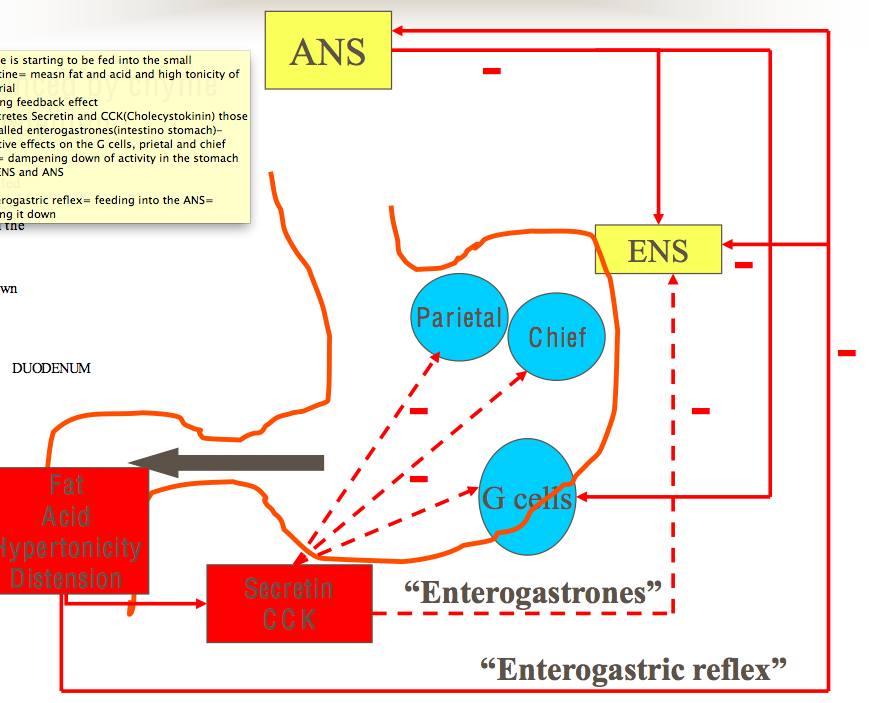 -Inhibitory : influenced by chyme entering duodenum -The remaining 10% of acid is secreted when chyme enters the small intestine, and is stimulated by small intestine distension and by amino acids. The duodenal cells release entero-oxyntin which acts on parietal cells without affecting gastrin -chyme is starting to be fed into the small intestine= measn fat and acid and high tonicity of material -strong feedback effect = secretes Secretin and CCK(Cholecystokinin) those are called enterogastrones(intestino stomach)- negative effects on the G cells, prietal and chief cells= dampening down of activity in the stomach and ENS and ANS