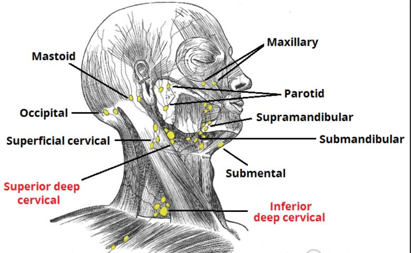 all of the lymph from the head and neck – either directly or indirectly via the superficial lymph nodes. They are organised into a vertical chain, located within close proximity to the internal jugular vein within the carotid sheath. The efferent vessels from the deep cervical lymph nodes converge to form the jugular lymphatic trunks.