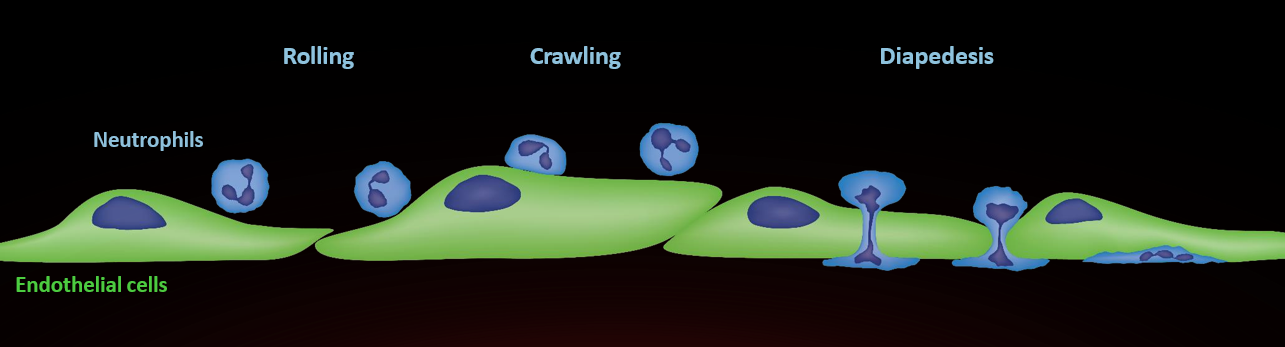 A neutrophil senses an infection in tissue. In the blood stream, neutrophils start rolling → arrest → adhesion to endothelium → crawling → diapedesis or transmigration through endothelium (trans- or paracellular).