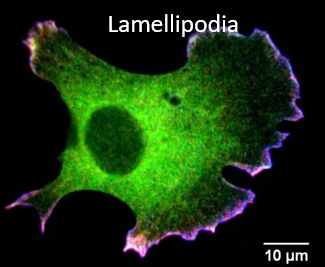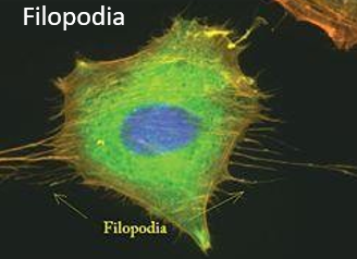 Cdc42 regulates the formation of filopodia, that are able to sense the environment. (Filopodia extend beyond the leading edge of lamellipodia in migrating cells).