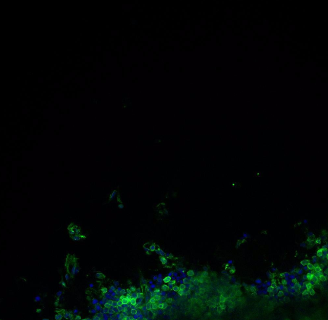You’ll see that the muscle is lined by endothelium that is lined completely green, which says that the endothelium is filled up with actin filaments.