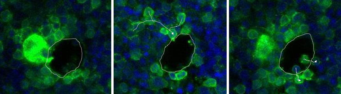 Endothelial cells are held together by VE-cadherin (CD144). So for invasion of immune cells through the vessel wall, the VE-cadherin connection between endothelial cells needs to be broken down.