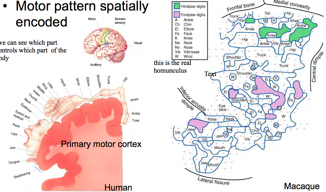• Motor pattern also electrically encoded • Each movement results from pattern of action potentials in specific subpopulations of neurons distributed through M1 • Movement of an arm involves postural stabilisation along with graded activation of flexor and extensor muscles in a specific sequence -can you just sum up the APs?
