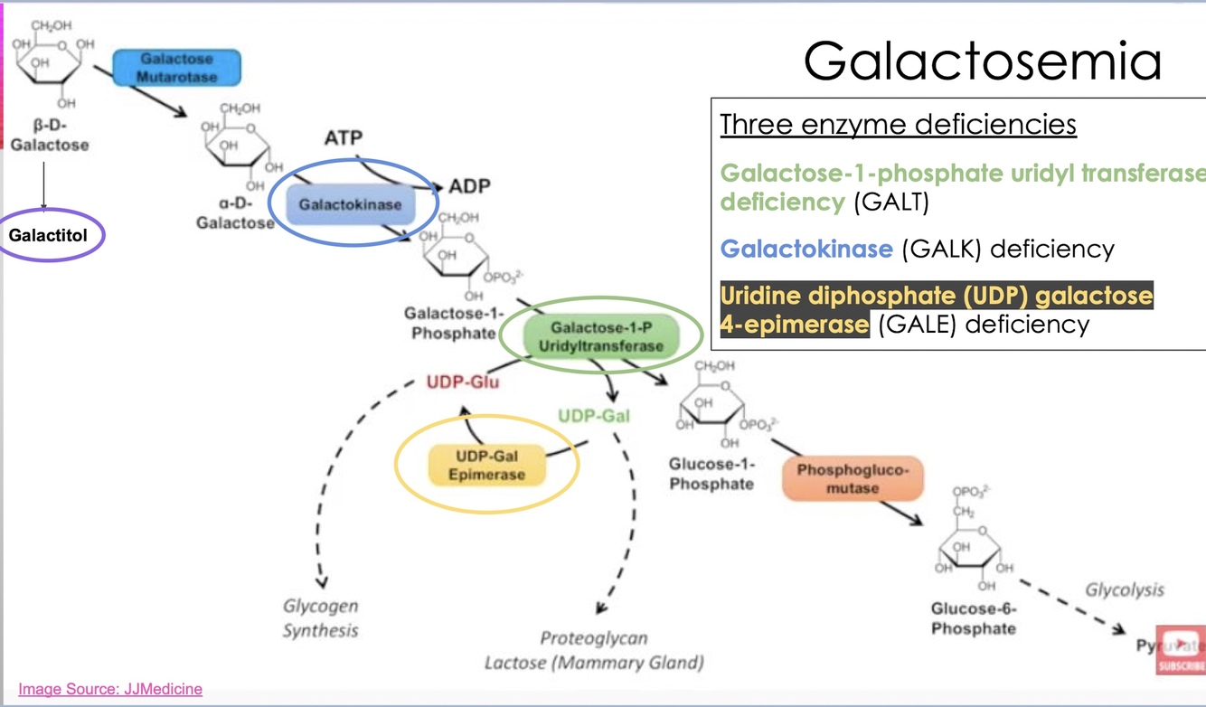 What 3 enzyme deficiencies result in galactosemia?
