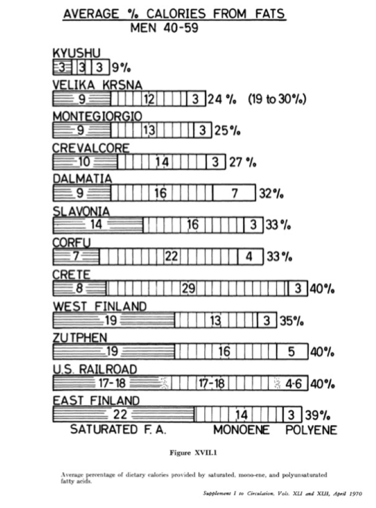 while countries like Finland had 39% total fat (22% saturated, 14% monounsaturated, 3% polyunsaturated)