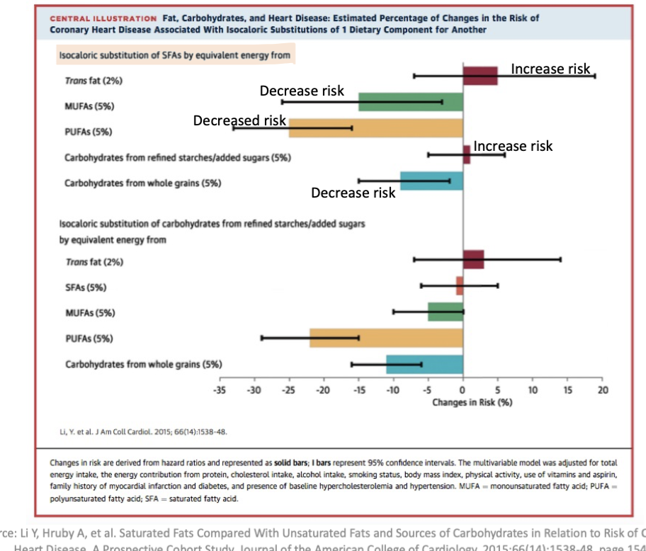 if you replace saturated fats with trans fats or carbohydrates from refined starches or added sugars, there was an increased risk of coronary heart disease, but replacing SFAs with MUFAs, PUFAs or carbohydrates from whole grains had a decreased risk