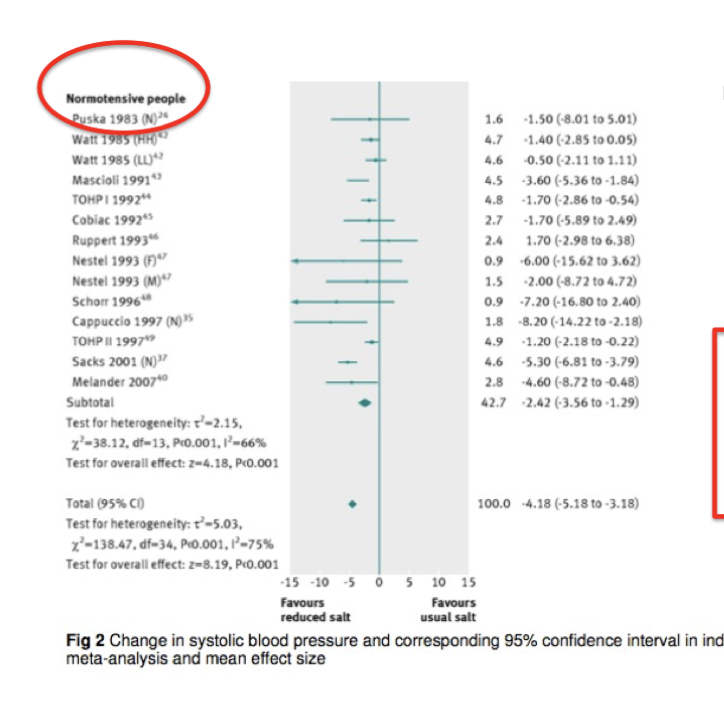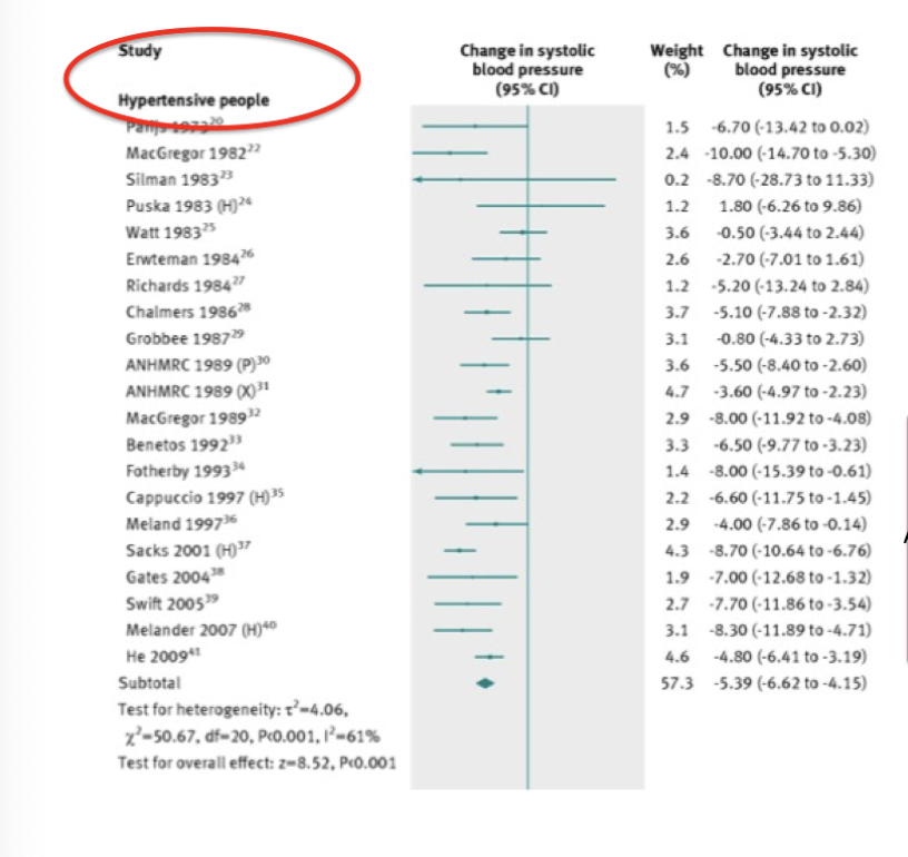people with a normal BP (non-hypertension) had a lower SBP with decreased sodium (-2.4mmHg) - smaller reduction than hypertension people