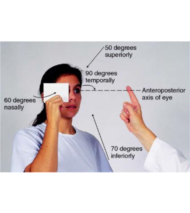 If client wears glasses, they should be left on unless they are reading glasses (reading glasses blur distance vision