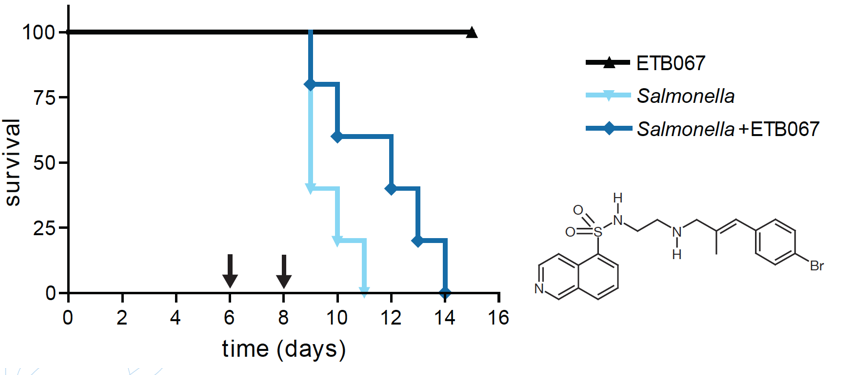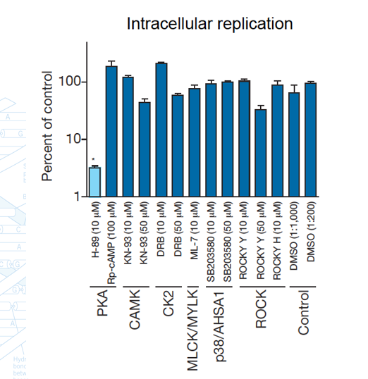 Inhibition of protein kinase A (PKA) reduced Salmonella growth. But this was only the case for the H-89 PKA inhibitor and not for Rp-cAMP PKA inhibitor. So this tells us that PKA isn’t actually a possible drug target.