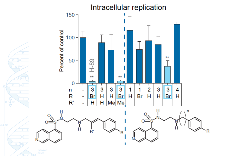 Here, different structures of H-89 were produced (adding extra methyl group, replacing certain groups, etc.). The variants were tested on whether they could block Salmonella replication. Next, these variants were combined with the kinase genes that reduced growth when knocked-down. Here, also the effectivity of the variants was tested.