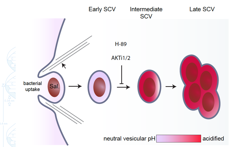 Uptake of Salmonella in vacuole inside host cell → H-89/Akt inhibitor blocks maturation process i.e. acidification.