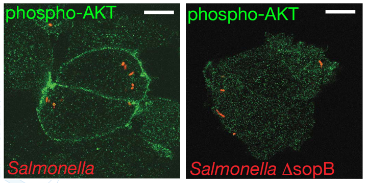 By visualizing activated/phosphorylated Akt in normal Salmonella and in sopB deficient Salmonella. sopB is a effector protein of Salmonella with phosphatase activity. They saw that when sopB was inactive/absent, Akt was not phosphorylated and thus not visualized.