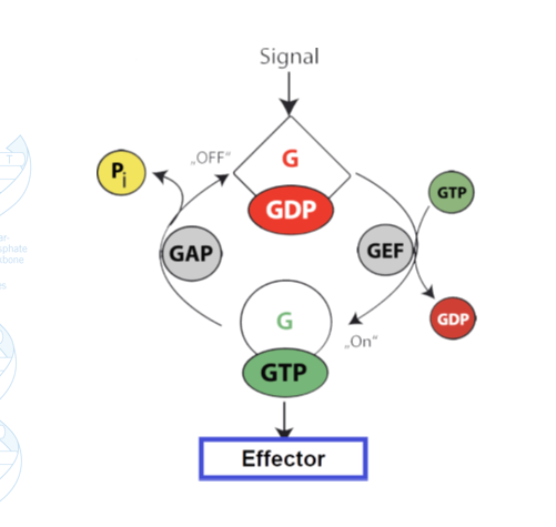 GTP-bound GTPases are on and can bind to effector proteins. GDP-bound GTPases are off. When GTP is bound to a GTPase, a GAP (GTPase activating protein) can remove a phosphate of GTP to inactive the GTPase. When GDP is bound, GEF (GTPase exchange factor) can remove GDP so that GTP can bind.