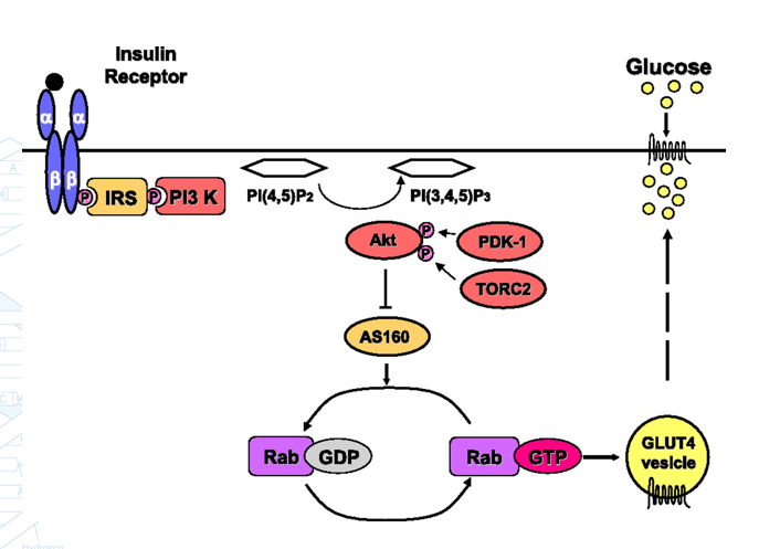When the insulin receptors bind insulin → Akt is activated → Akt phosphorylates and inactivates AS160 → AS160 normally acts as a GAP and inactivates Rab, but now cannot do so → Rab stays active → production Glut4 vesicles