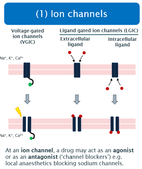 How may drugs act at ion channels?