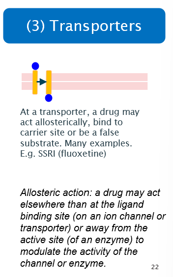 How may drugs act at transporters?