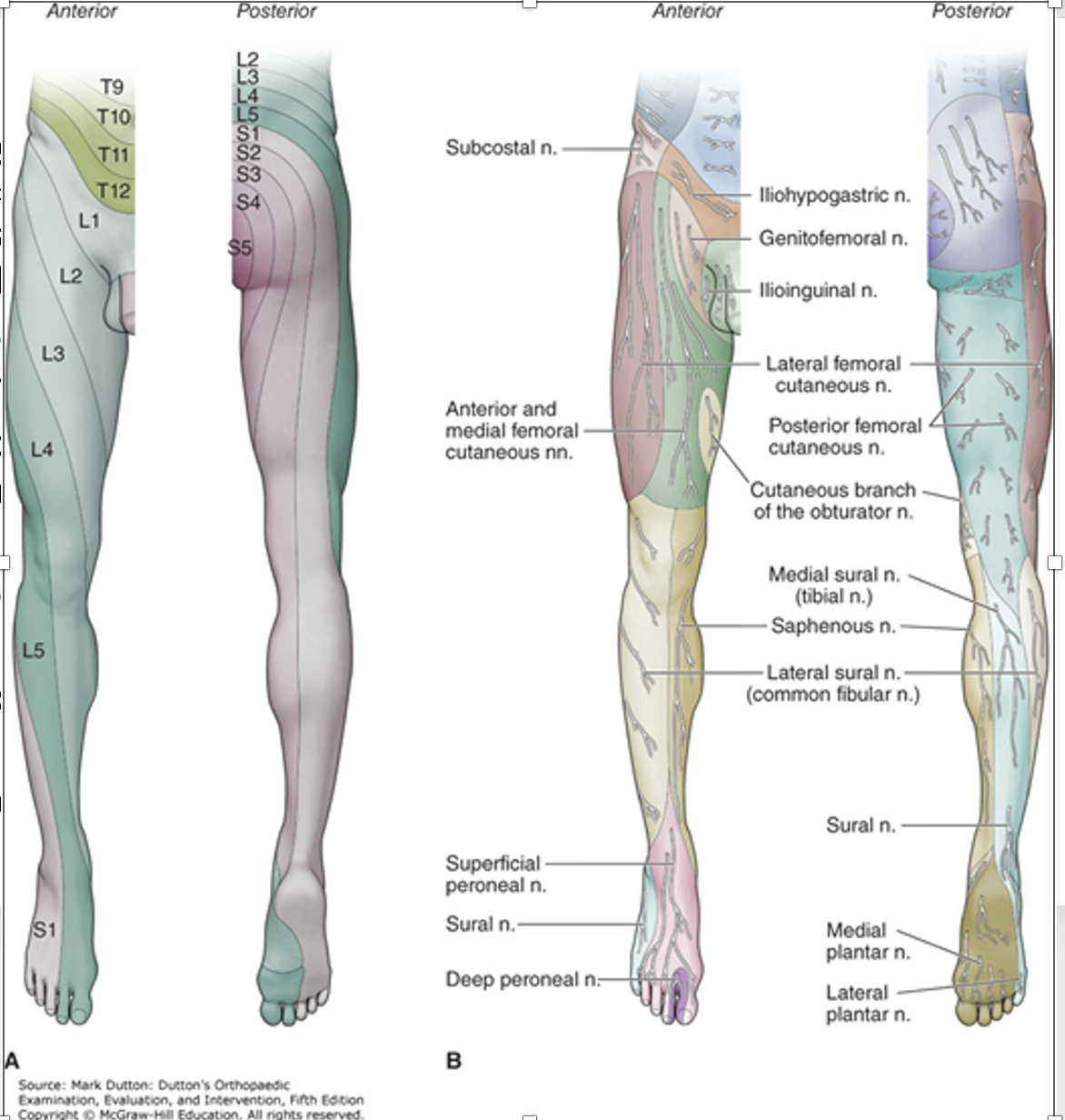 Starts at L5 and wraps around to lateral upper leg (goes lateral knee) then wraps to the middle of the calf then moves to medial 1/2 of dorsal / plantar surface of foot.