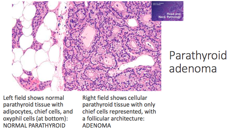 What is the typically seen microscopically in parathyroid adenomas; what is the dominant cell type?