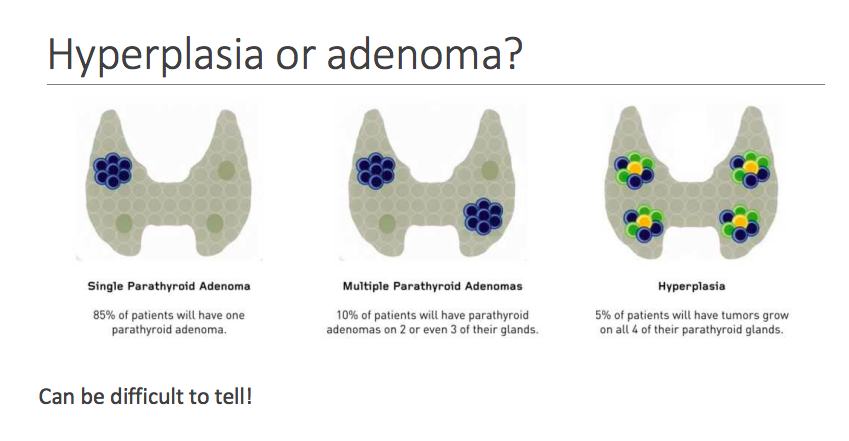 How does parathyoid adenoma differ from hyperplasia in terms of glands involved?