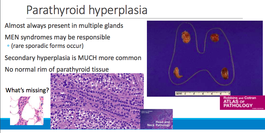 Which morphological feature of the normal parathyroid glands becomes inconspicous in adenomas and hyperplasia?