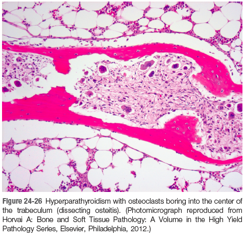 What 3 interrelated skeletal abnormalities can manifest as a result of symptomatic, untreated hyperparathyroidism?