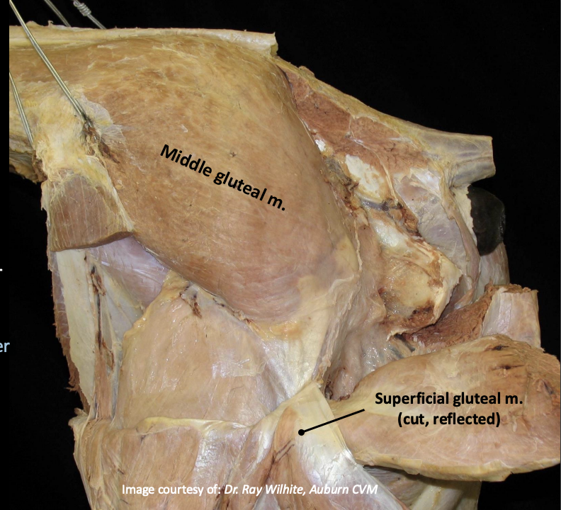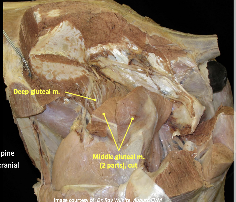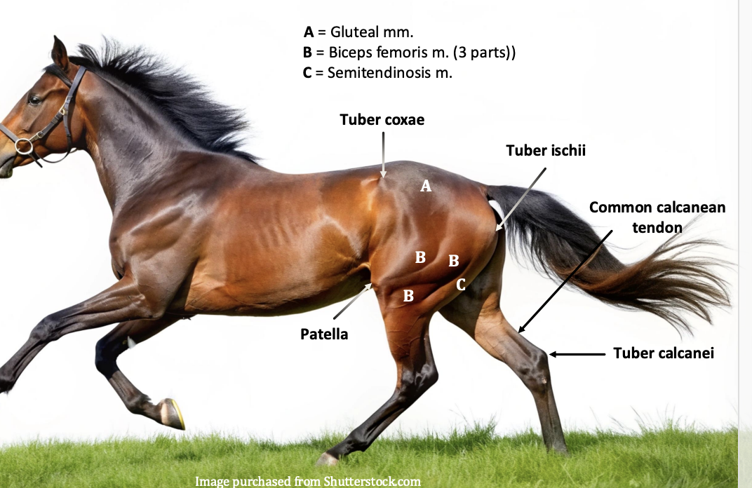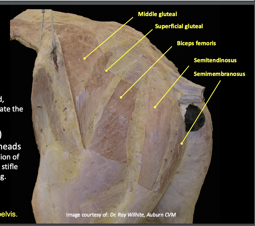 Collectively act in extension of coxal joint and flexion of stifle when non-weight bearing.