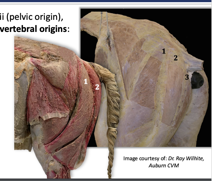 All caudal thigh muscles take partial origin from tuber ischii (pelvic origin), but have additional (more proximal) vertebral origins: