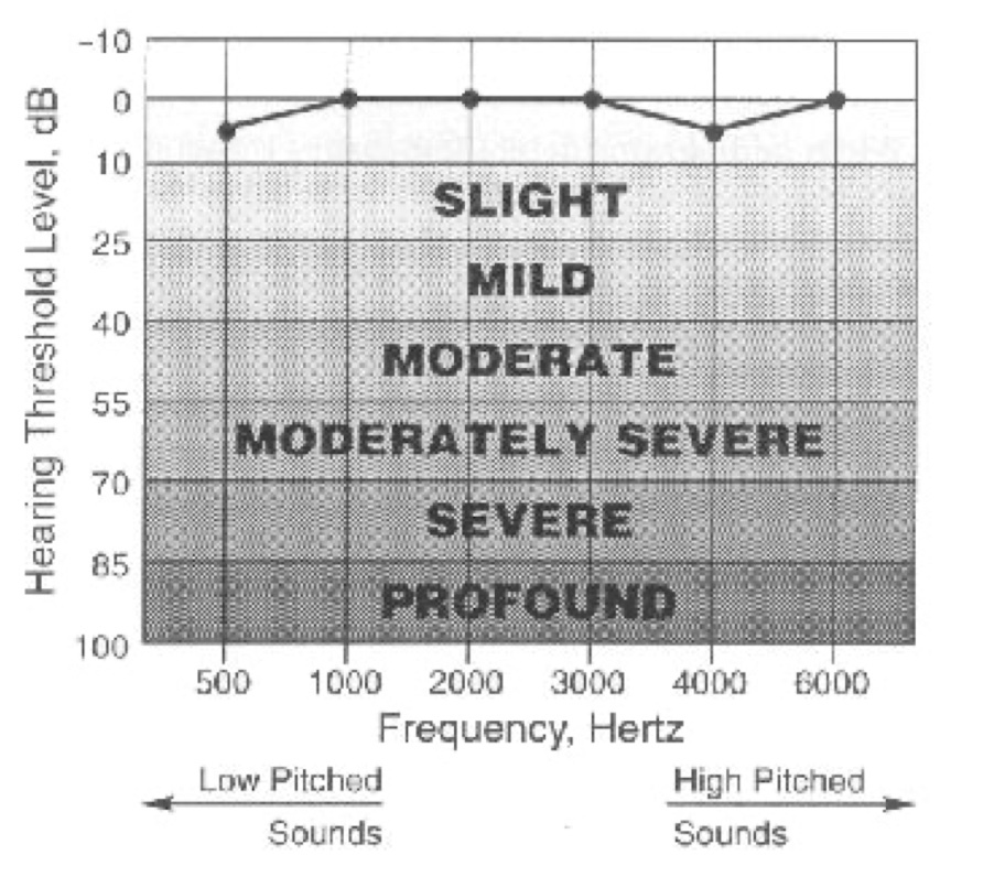 Each frequency is plotted based on what decibel the patient could hear it at. Both ears are tested, generating a graph, which is then compared to a standard.