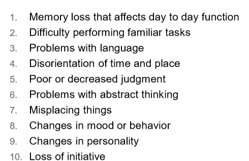 Name 10 warning signs/symptoms for cognitive decline from dementia