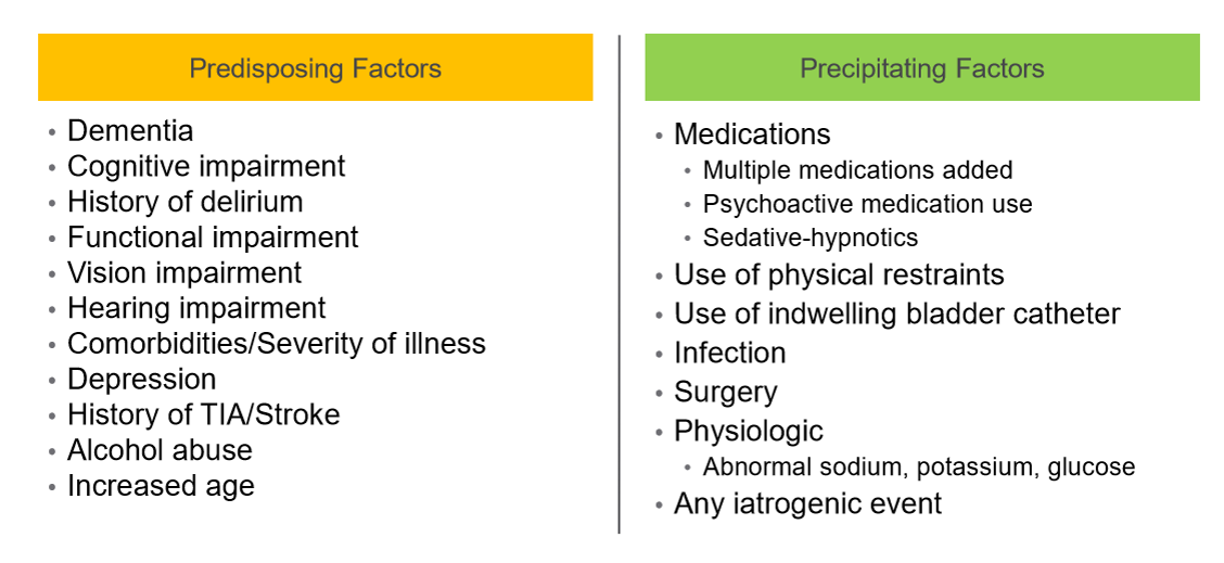 What are predisposing and precipitating factors of delirium