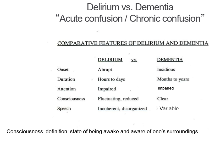 Compare delirium vs dementia