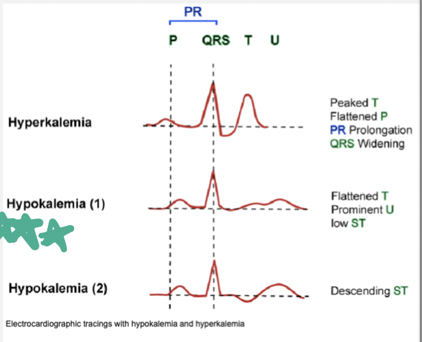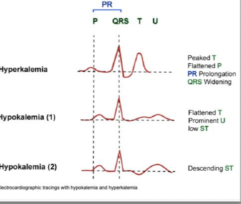 * Typical electrocardiographic (ECG) features of hypokalemia include widespread ST depression, T wave inversion, and prominent U waves. Hypokalemia may present with different types of arrhythmia, such as premature ventricular contractions, ventricular fibrillation, atrial fibrillation, and torsade de pointes.