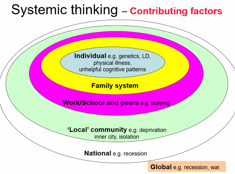 Systemically - thinking about the systems around the individuals e.g. individual, family sytsem, work/school and peer, ‘local’ community (socia;/cultural/religious), national system, global system
