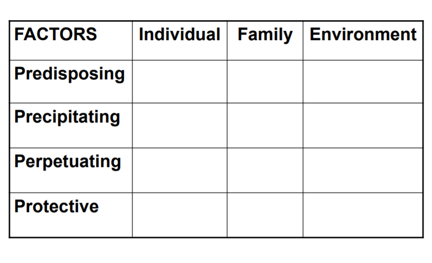 Systematically - 4Ps - predisposing, precipitating, perpetuation and protective factors
