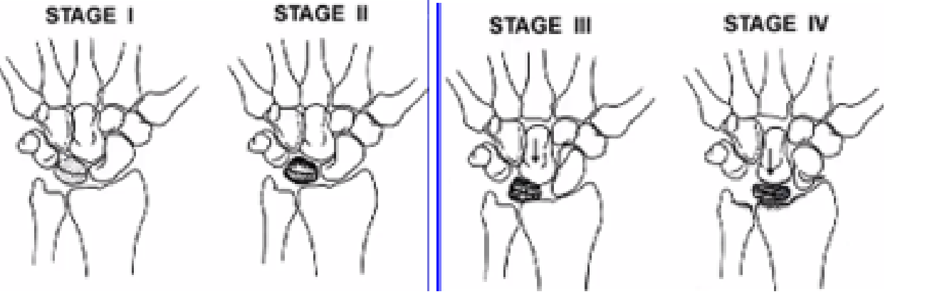 Posee 4 estadios (el hueso grande desciende y ocupa lugar del semilunar, alterando movilidad carpal)