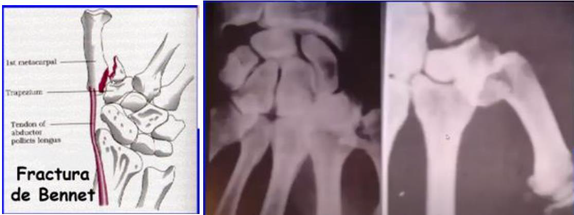 El fragmento cubital de la base del 1° mtc queda insertado en la articulación y el resto del hueso se desplaza.
