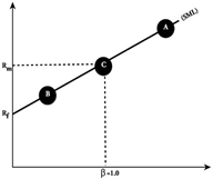 The x-axis in this graph is risk. Portfolio A is furthest along the x-axis and therefore the riskiest. Option (A) is incorrect as the beta for C is the market beta of 1.0, while the beta for B is less than 1.0 and the beta for A is more than 1.0. Option (B) is incorrect because the return for C will equal the return for the market, which is also the market premium plus the risk-free rate. Option (C) is incorrect as A’s return could equal 15 percent if the beta for A were 1.3333.