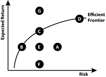Option (A) return and standard deviation = 6.5% and 9.14%, respectively. Option (B) return and standard deviation = 7.0% and 8.62%, respectively. Option (C) return and standard deviation = 7.5% and 8.49%, respectively. The most efficient (highest return for given level of risk) is Option (C). Options (A) and (B) are inefficient.