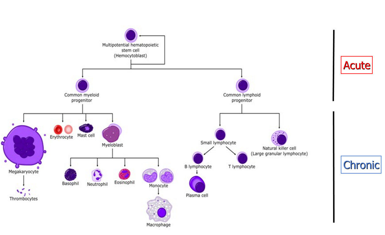 Acute or chronic is based on the degree of cell differentiation (NOT duration of disease):