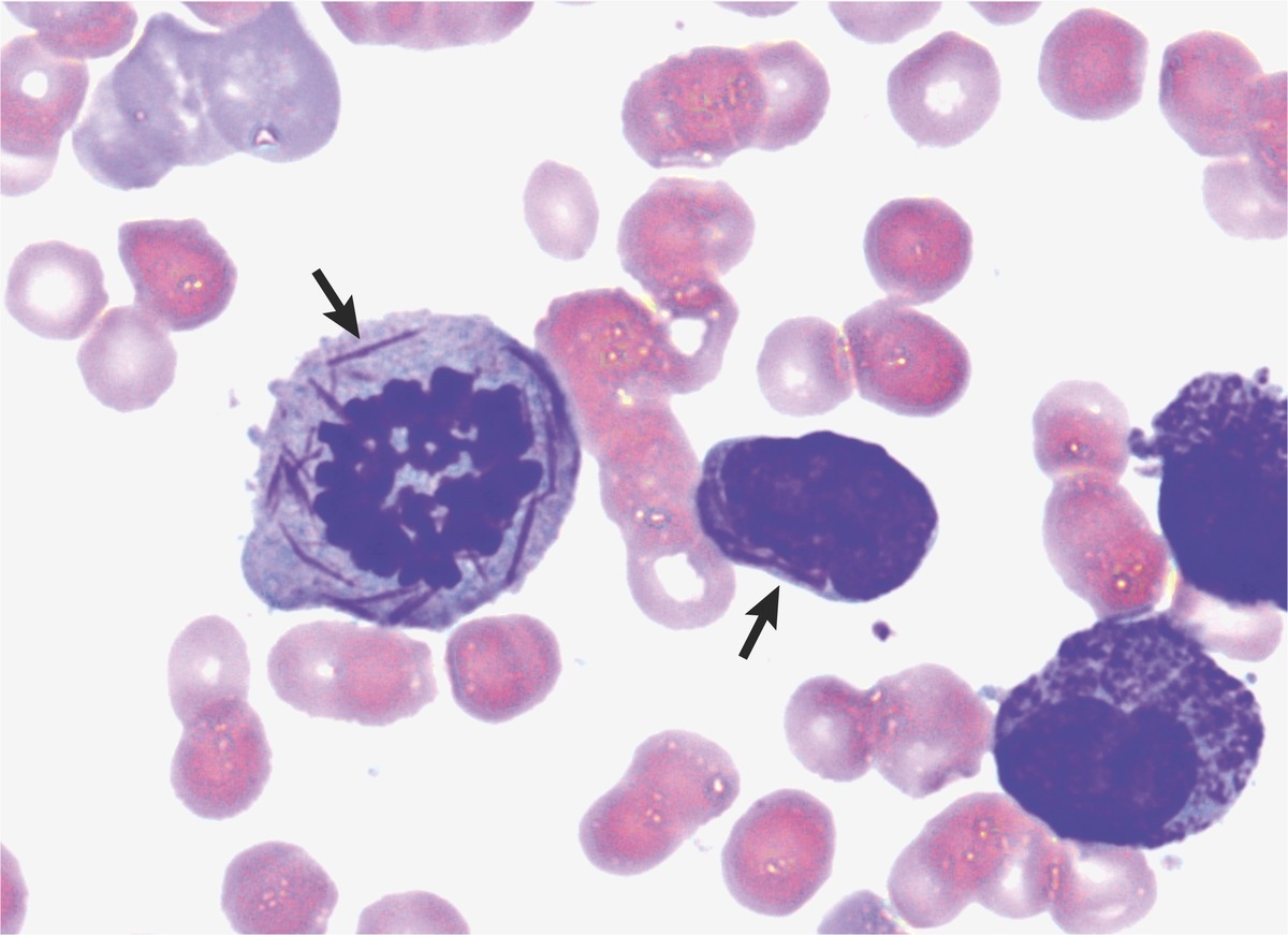 Genetic mutation in precursor cell in bone marrow leads to excessive production of a single type of abnormal leucocyte (white blood cell). Excessive production of this single type of cell can lead to suppression of other cell lines causing pancytopenia