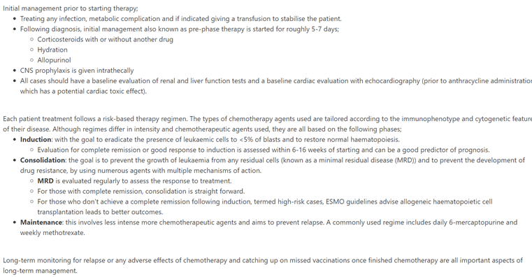 For acute lymphoblastic leukaemia, discuss: